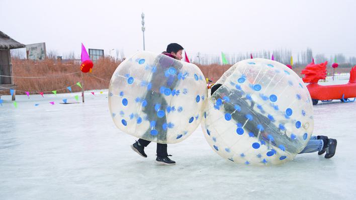 1月27日,游客在阿克苏市皇宫湖沙漠湖泊旅游度假区内的滑冰场体验冰上碰碰球项目。通讯员 魏源 摄